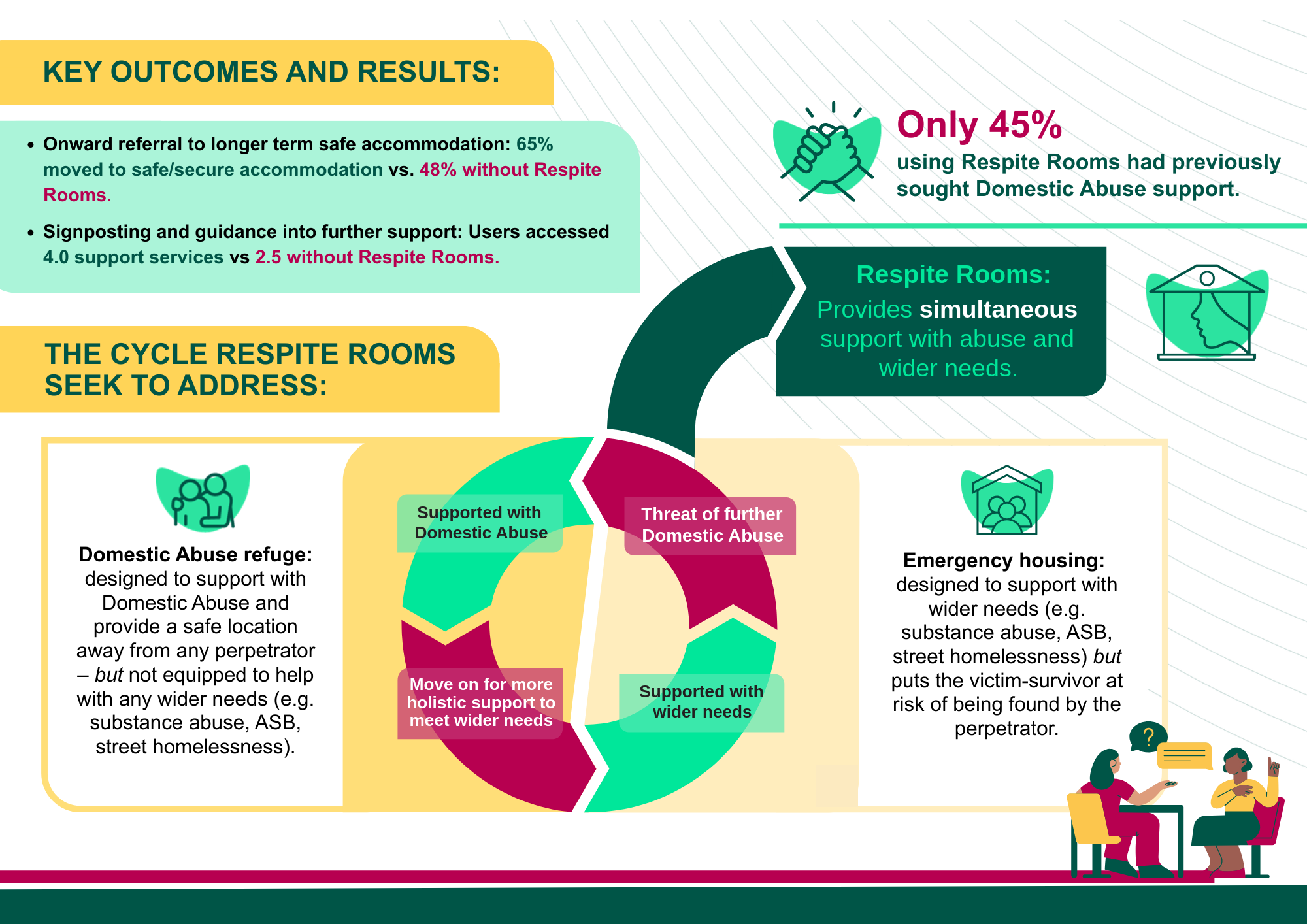 The Respite Rooms pilot supported nearly 800 people; by study of outcomes in several Respite Rooms, the evaluation revealed a statistically significant positive impact, a rarity in research assessing programmes seeking to assist people experiencing homelessness or domestic abuse: