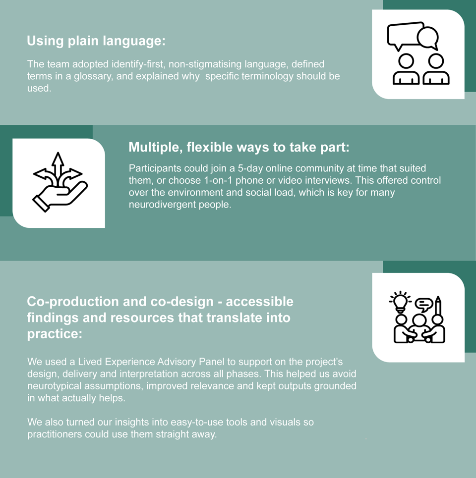 What accessibility looks like can differ from project to project. It is shaped by who the research is for, what is being explored, and where barriers to participation are most likely to arise. Here are two examples of where accessibility was a key part of the research process, focusing on neuro-inclusive support.
