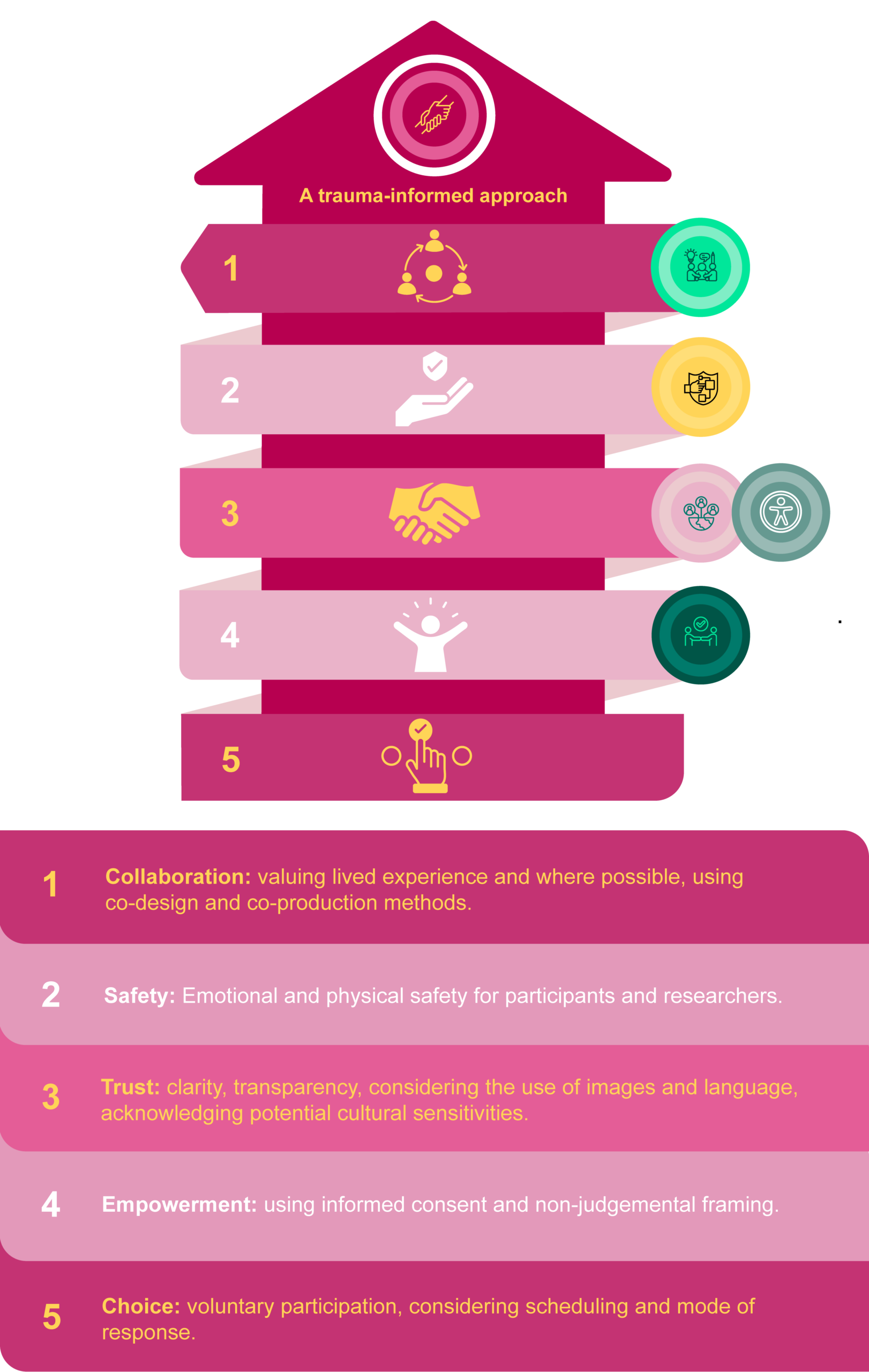 Trauma‑informed research recognises the varied nature of trauma and designs studies that prioritise wellbeing and uses a non-judgemental approach.