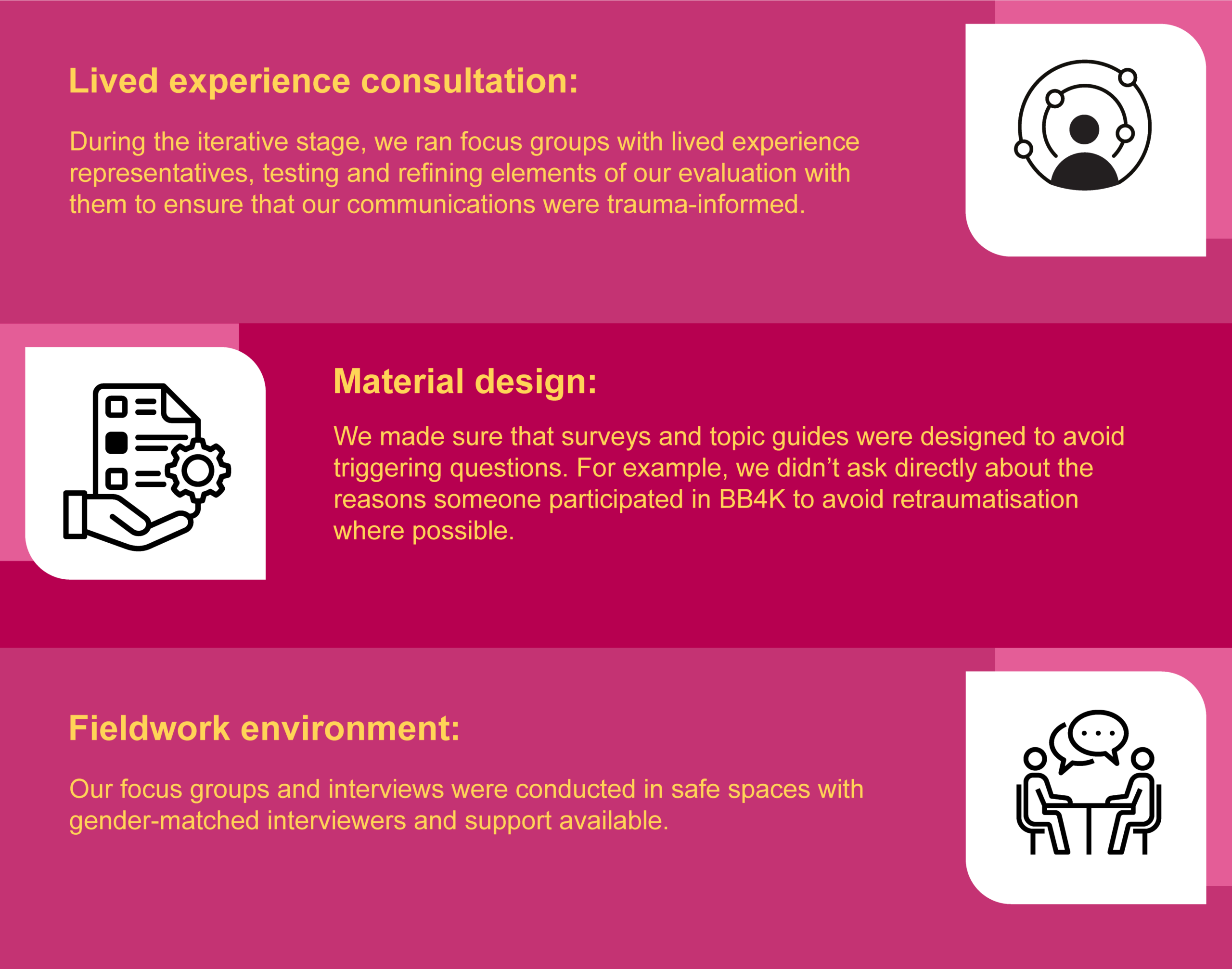 For our evaluation of BB4K, a therapy-informed programme supporting parents and children affected by domestic abuse, we prioritised reducing the risk of re-traumatisation and creating conditions for participants to feel comfortable: